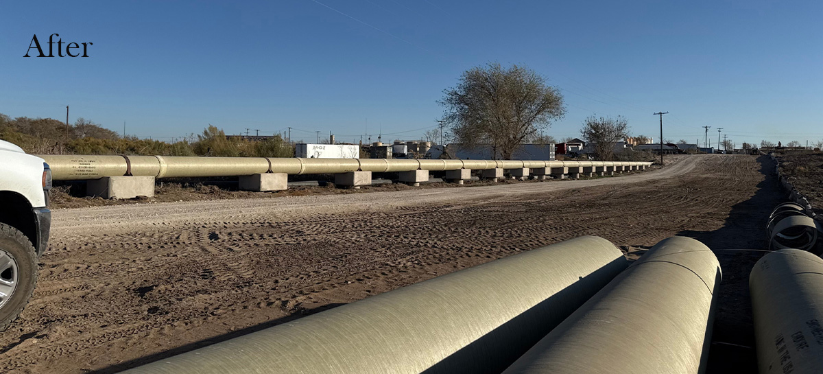 This emergency infrastructure project delivered critical pipeline and manhole upgrades to improve long-term system reliability in Odessa, Texas. Scope included removal of 1,000 LF of existing 24” ductile iron pipe, installation of new 24” FRPM piping with seamless tie-ins, construction of new polymer concrete and doghouse manholes, and development of a new access road to support both construction and future maintenance. The result: enhanced durability, improved access, and strengthened service continuity.